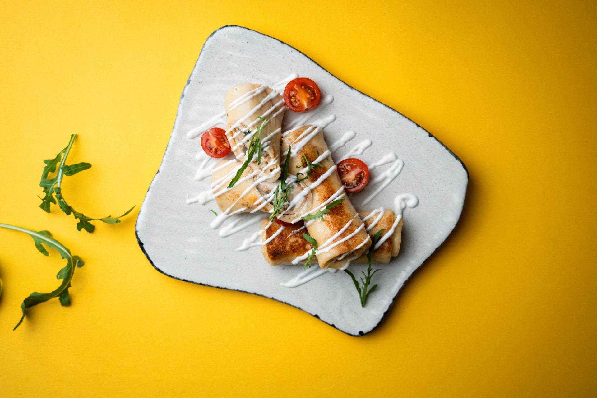 Млинці, куряче філе, шпинат, гриби, моцарела, сметана, чері.