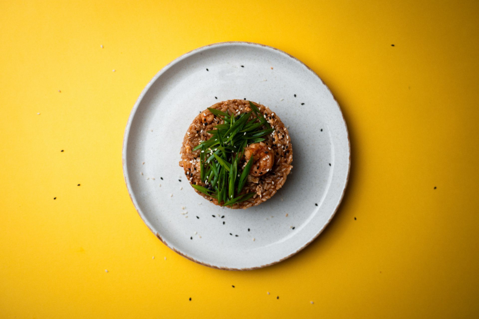 Рис, креветка, цибуля ріпчаста, соус кімчі, кунжут, яйце, соєвий соус, цибуля зелена.