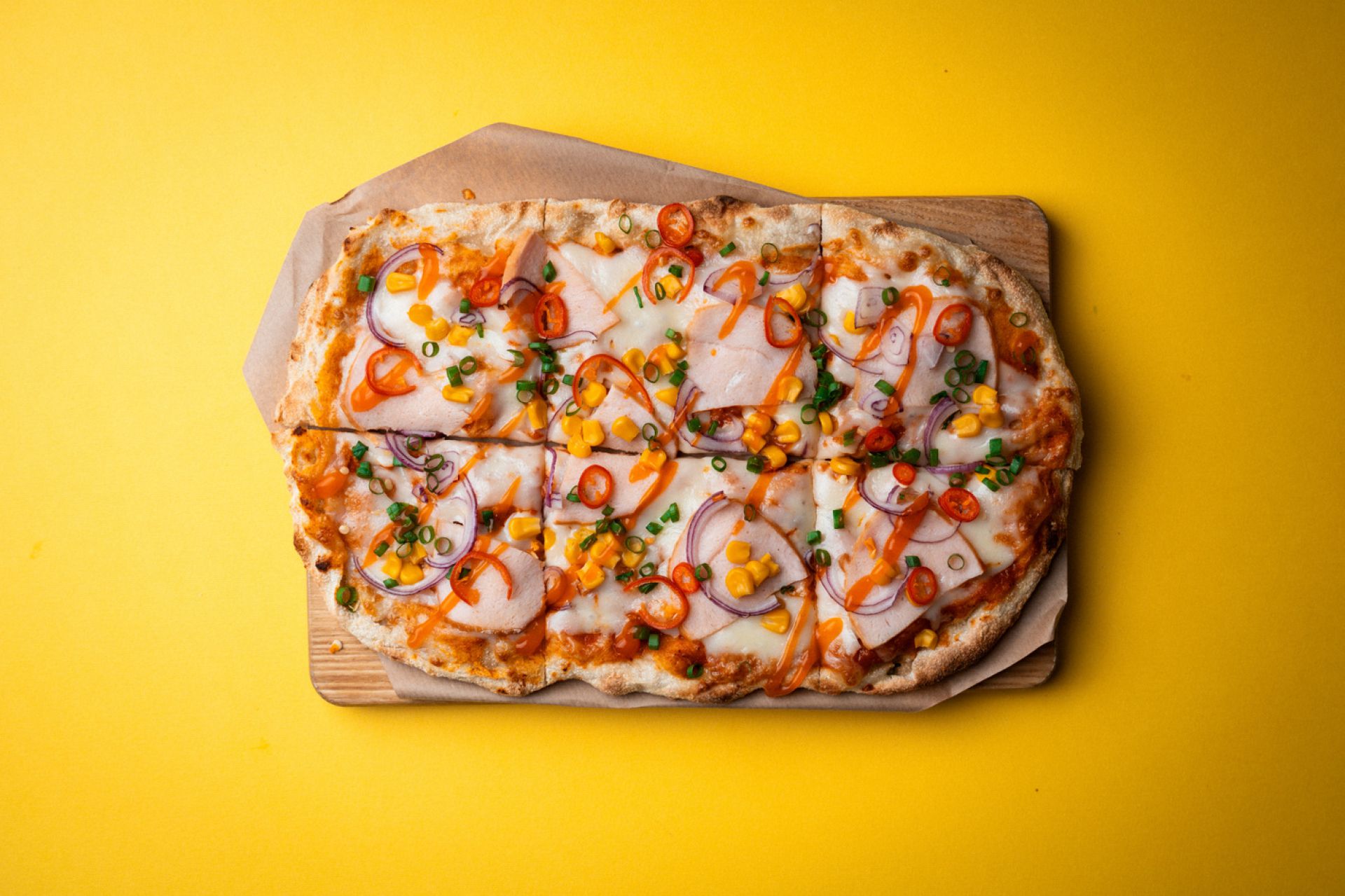 Аджика, соус кімчі, моцарела, куряче філе, кукурудза консервована, цибуля кримська, соус чилі, цибуля зелена.