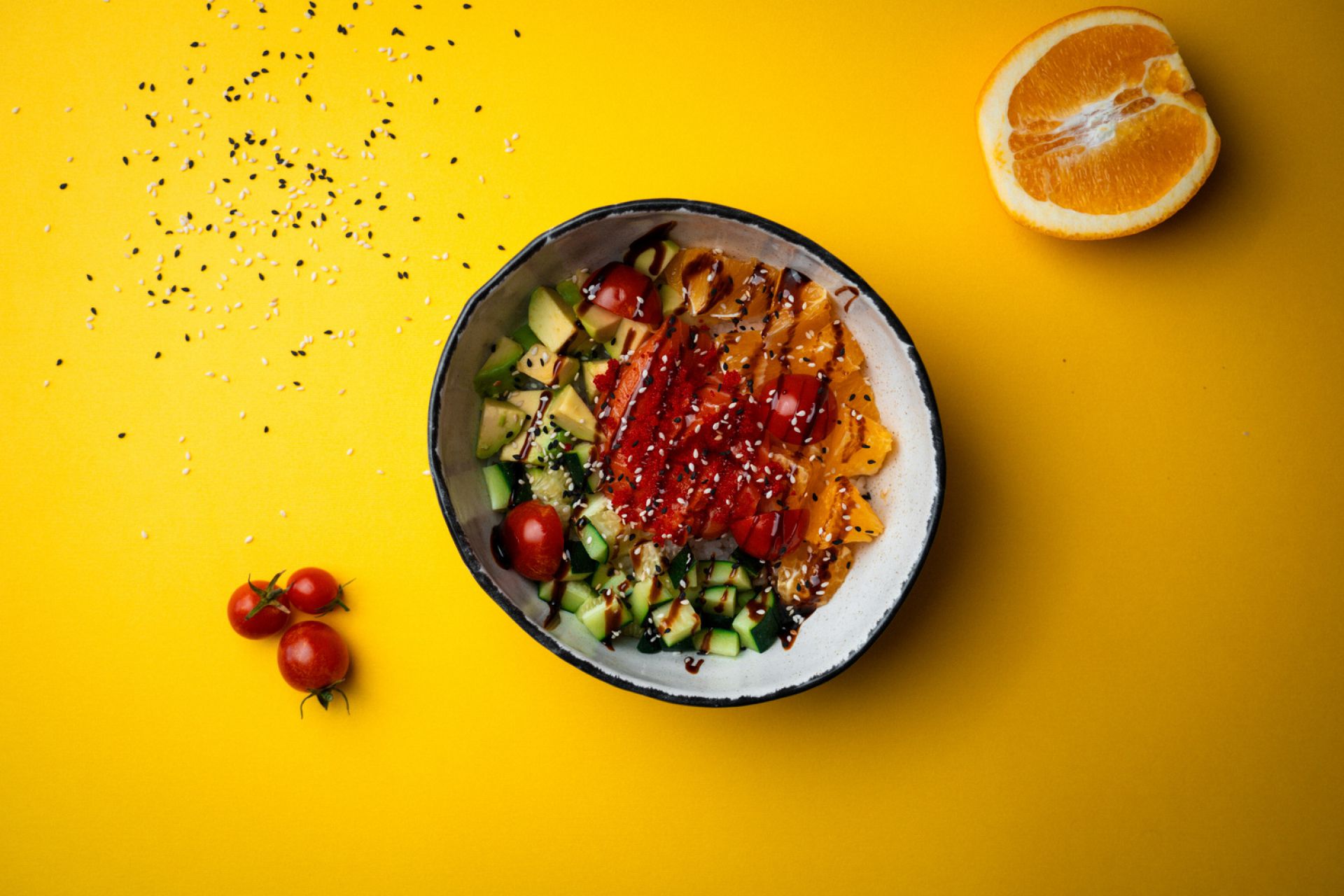Лосось, рис, авокадо, апельсин, огірок, чері, соус унагі, кунжут, ікра масаго.