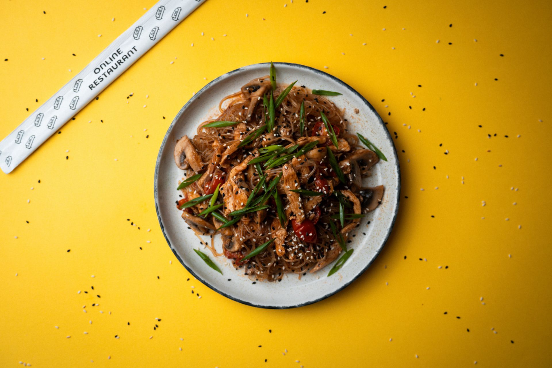 Куряче філе, гриби, чері, фунчоза, соус кімчі, соєвий соус, цибуля зелена, кунжут.