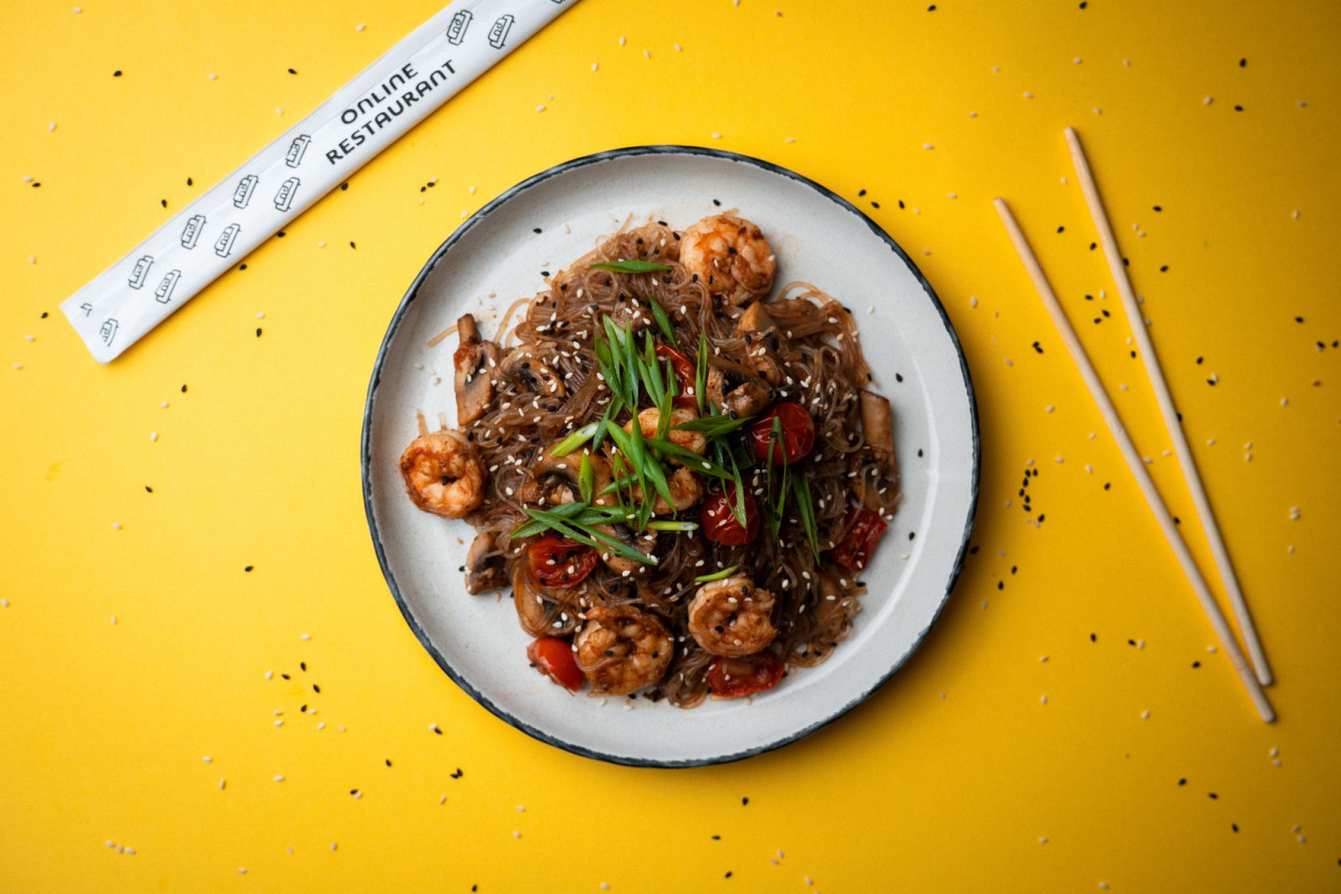 Креветка, чері, гриби, фунчоза, соус кімчі, соєвий соус, цибуля зелена, кунжут.