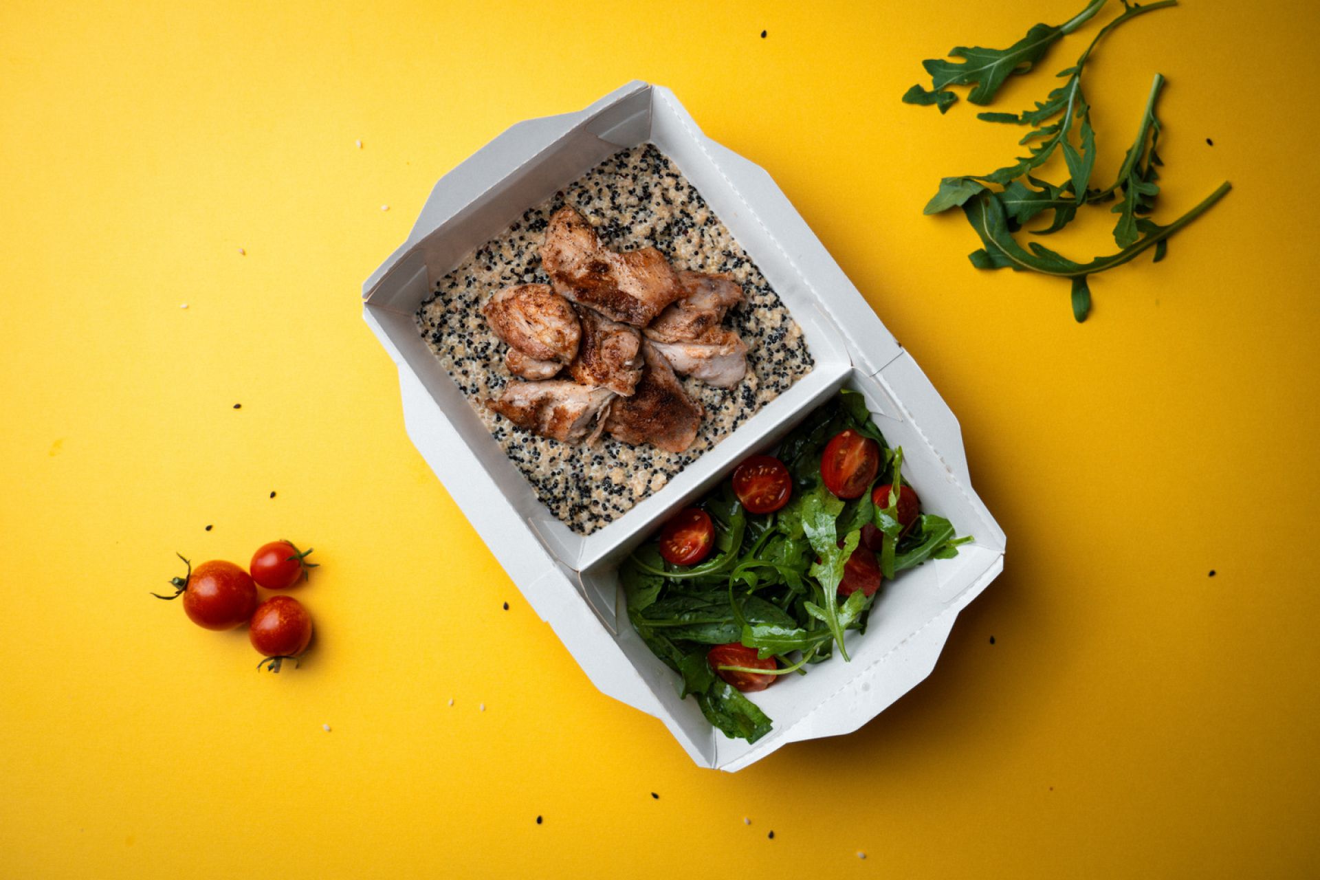 Кіноа, сир моцарела, вершки, куряче стегно, рукола, шпинат, чері.