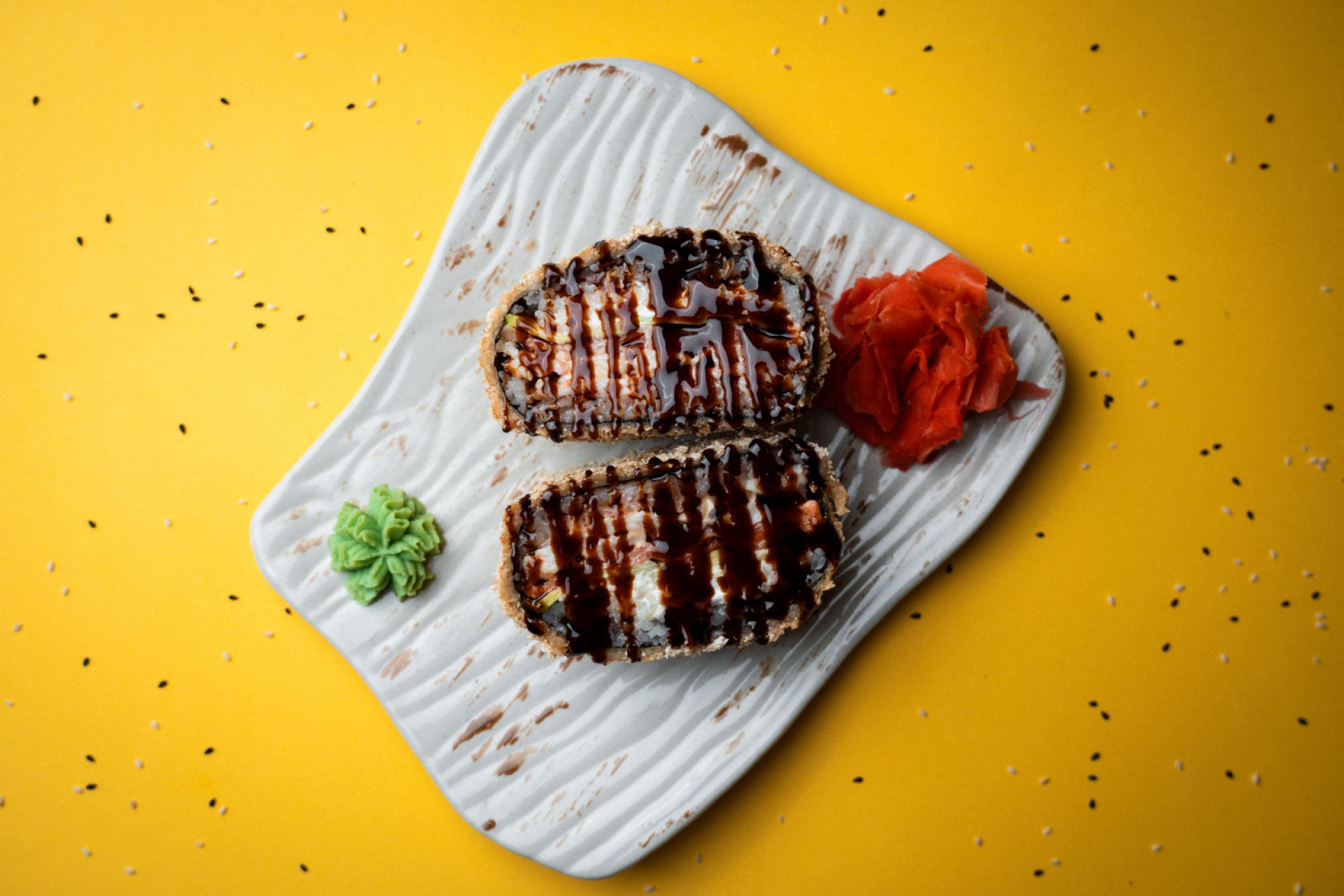 Рис, сир філадельфія, авокадо, лосось, креветка, ікра масаго, соус спайс.