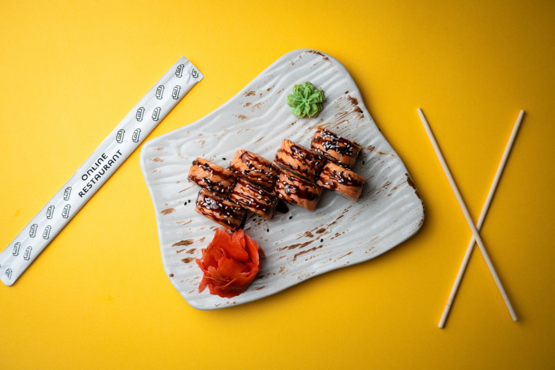 Рис, сир філадельфія, авокадо, лосось, соус унагі, кунжут.
